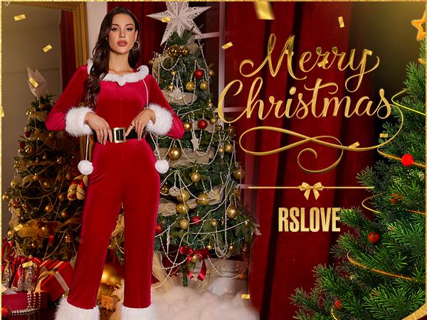 RSLOVE Women'S Christmas Jumpsuit - Velvet Santa Costume Faux Fur Trim One Piece Holiday Xmas Outfit with Belt Red